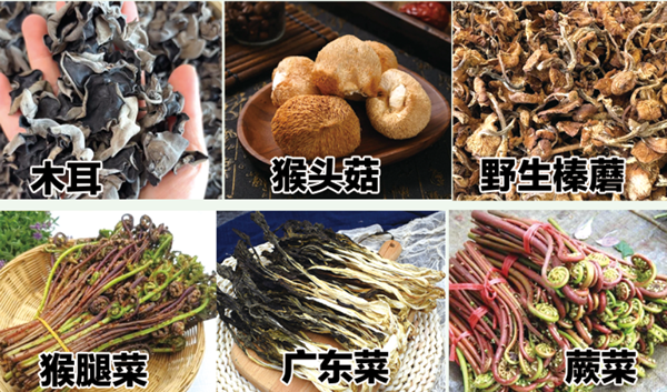 菌肉鮮嫩的猴頭菇,木耳、榛蘑、山野菜、豆角干等純天然食材。