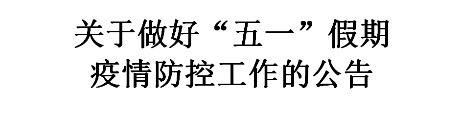 為切實做好“五一”期間新冠肺炎疫情防控工作,認真落實好“外防輸入、內(nèi)防反彈”嚴(yán)十條要求,切實保障人民群眾身體健康,現(xiàn)將有關(guān)事宜公告如下。