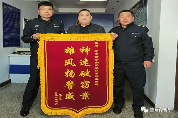 10月15日,肇東市黎明鎮民富村某裝飾材料加工廠負責人陳某到肇東市公安局黎明第二派出所,將一面印有“神速破竊案  雄風揚警威”的錦旗贈送給派出所民警,對派出所在短時期內破獲其廠內工人財物被盜案表示感謝。