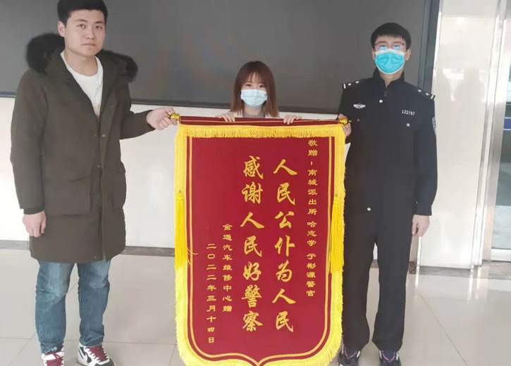 近日,肇東市七道街居民韓女士將一面印有“人民公仆為人民、感謝人民好警察”的錦旗,贈(zèng)予南城派出所的民警,以表達(dá)民警為其找回失物,挽回?cái)?shù)千元經(jīng)濟(jì)損失的感激之情。