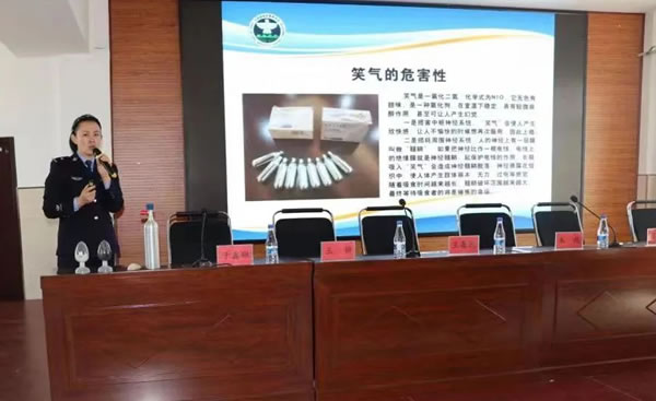 活動中,禁毒工作人員利用PPT課間,用通俗易懂的語言,帶領學生們了解了佐匹克隆、氫溴酸右美沙芬片、復方曲馬多等精神藥品知識,講解了新興毒品的危害,發放了新興毒品知識宣傳資料,展示了仿真毒品模型,并與學生們進行了知識問答互動,加深學生們對禁毒知識的了解。如何遠離毒品、青少年吸食毒品的誘因分析等知識,構筑起拒毒心理防線。同時民警提醒師生們要清醒認識吸食“笑氣”的危害性,自覺抵制并做到不好奇、不嘗試、不濫用。