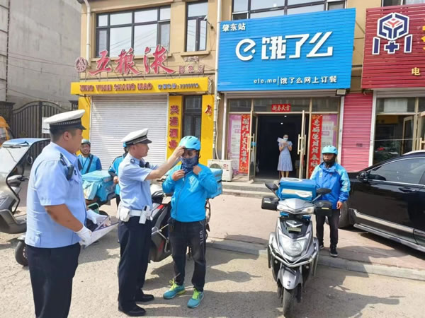 在“餓了么”外賣企業,民警首先同企業負責人進行了深入詳談,要求企業加強對員工的交通安全教育,時刻繃緊安全神經,把交通安全放在工作首位。要求騎手出行必須正確佩戴合格頭盔,最大限度降低交通安全風險;貨車出行司乘人員要正確系好安全帶,嚴格遵守交通規則。之后民警向企業員工們宣講了“一盔一帶”等交通安全知識,檢查了騎手佩戴安全頭盔情況,發放宣傳單、手冊等宣傳資料,并為騎手現場講解了正確佩戴頭盔的重要性和必要性。