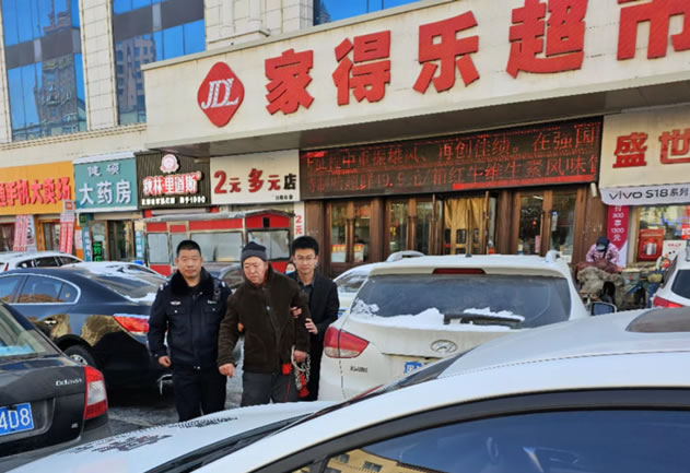 1月22日11時許,紅旗派出所接到轄區家得樂超市工作人員報警稱超市內有一名老人找不到家了,接到報警后紅旗派出所教導員楊玉軍立即帶領輔警張國健、李建成到達現場,向老人耐心細致地詢問情況,可老人只記得自己的名字及家住肇東市二糧庫樓,并無法記清具體單元及門牌號,且身上沒有任何證件、手機及家屬聯系方式,行動也十分不便。