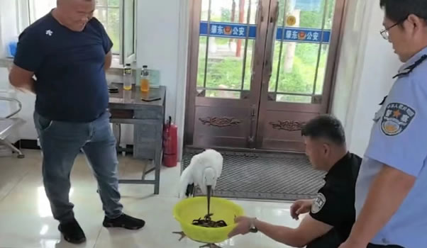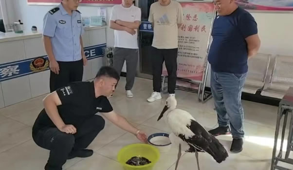 8月28日,躍進(jìn)鄉(xiāng)福龍村書(shū)記宋健來(lái)到肇東市公安局躍進(jìn)派出所,稱在躍進(jìn)鄉(xiāng)福龍村新發(fā)屯草甸子上發(fā)現(xiàn)一只大鳥(niǎo)晃晃蕩蕩落在草甸子上,不斷哀鳴。大鳥(niǎo)體長(zhǎng)120厘米左右,身上大部分呈白色,翅膀下方呈黑色,嘴部呈黑色,嘴的基部較厚,往尖端逐漸變細(xì),并且略微向上翹,前頸的下部有呈披針形的長(zhǎng)羽,腿部較長(zhǎng)。但他一下子想不起來(lái)鳥(niǎo)的名字,只是知道它應(yīng)該是保護(hù)動(dòng)物,因此請(qǐng)求派出所進(jìn)行救助。宋健介紹不知為什么,發(fā)現(xiàn)時(shí)這只大鳥(niǎo)不飛、不動(dòng),行動(dòng)遲緩,也不曾進(jìn)食,走上前也不怕,站在原地,他趕緊將它抱到派出所。民警看到大鳥(niǎo)后宛如“仙鶴”下凡,優(yōu)美的體態(tài),潔白的羽毛,朱紅色的眼眶,寬而長(zhǎng)的翅膀,一看就是不尋常的鳥(niǎo),民警擔(dān)心它有傷或是生病了,立即聯(lián)系肇東市林業(yè)部門,尋求專業(yè)的指導(dǎo);經(jīng)專家仔細(xì)辨認(rèn),這只鳥(niǎo)類并不是“仙鶴”,而是被譽(yù)為“鳥(niǎo)中大熊貓”的東方白鸛,是國(guó)家一級(jí)保護(hù)動(dòng)物。經(jīng)初步檢查,其外表沒(méi)有明顯傷痕,右側(cè)翅膀受點(diǎn)輕傷耷拉下來(lái),但整體狀態(tài)較為虛弱,民警在派出所設(shè)置臨時(shí)保護(hù)區(qū)域,確保動(dòng)物的安全,避免其受到二次傷害,民警拿來(lái)小魚(yú)和水進(jìn)行投喂,白鸛簡(jiǎn)單吃了幾只小魚(yú)。隨后民警對(duì)村書(shū)記的救助行為表示感謝。