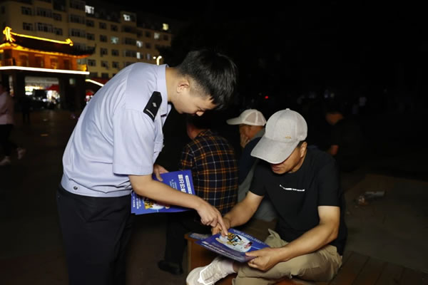 民警利用夜間群眾休閑納涼的有利時機,通過集中宣傳和定點講解等方式,提醒群眾增強安全防范意識。同時,充分發(fā)揮社區(qū)群眾聚集多、消息傳播快、宣傳精度高優(yōu)勢,發(fā)放宣傳資料把“五防”知識送上門、讓安全知識深入人心。
