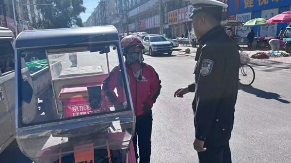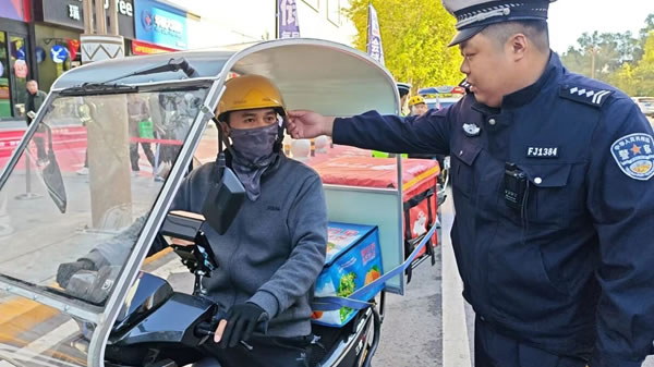 行動中,民輔警在城區電動車、摩托車通行集中路段,對摩托車、電動車逐輛進行檢查,對未正確佩戴安全頭盔的騎乘人員,現場講解正確佩戴頭盔的方法及佩戴頭盔的重要性和必要性。對未佩戴安全頭盔的騎乘人員進行教育、警告。并當面宣講交通安全法律法規等安全知識,詳細剖析駕乘電動車、摩托車不佩戴安全頭盔的嚴重危害和后果。尤其針對外賣、快遞等配送人員,民輔警在街頭逐一檢查車輛運行手續和安全性能、頭盔是否符合國家標準等情況,明確要求快遞配送人員必須發揮重點行業示范引領作用,時刻戴好安全頭盔,遵守交通法規,做好交通安全的帶頭人。