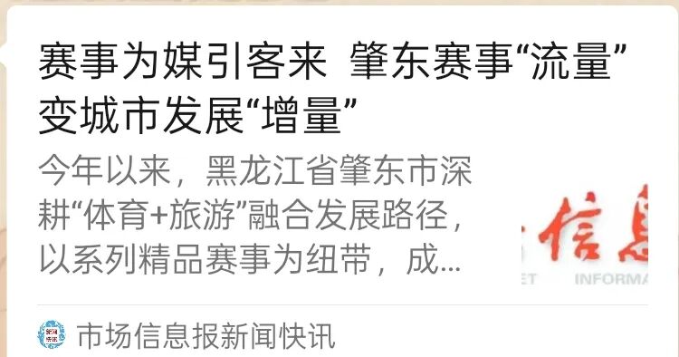 近日,肇東市以系列精品賽事為核心的文體旅融合發(fā)展模式引發(fā)多家媒體集中關(guān)注,今日頭條、騰訊新聞、搜狐新聞、百度、市場(chǎng)信息報(bào)信息快訊等多家媒體相繼聚焦其賽事經(jīng)濟(jì)成效進(jìn)行專(zhuān)題報(bào)道,讓肇東“以賽促游、以游興城”的發(fā)展故事成為矚目焦點(diǎn),賽事經(jīng)濟(jì)成為城市的新名片。