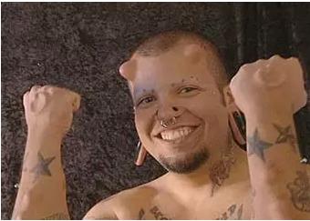 美國有位路易桑切茲的兄臺,為了讓自己看起來像一頭小牛,也是在自己的額頭做功課,愣是移植了兩只“角”,不只如此,他還給自己裝了耳環(huán)和鼻環(huán)。要是“犄角”再長一些點,加上一個假頭套,活脫脫就是西游記里跳出來的牛魔王。