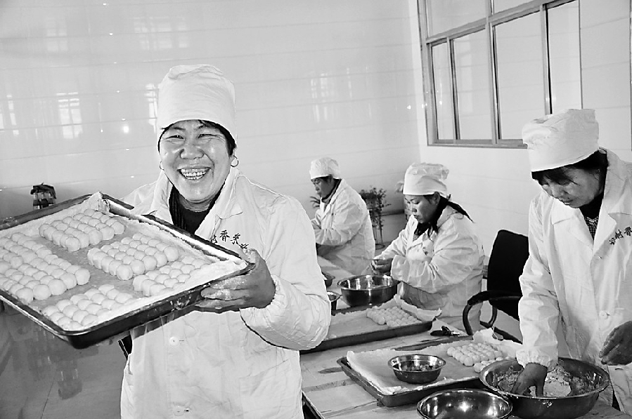 圖為里木店鎮(zhèn)裕村香谷物種植合作社正在手工生產(chǎn)的有機(jī)粘豆包。