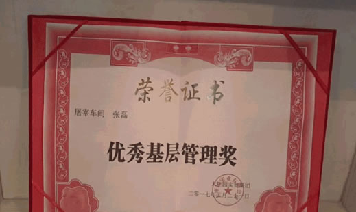 2014年張磊同志多次獲得技術能手稱號,所帶領的班組榮獲“學雷鋒標兵班組”; 2016年4月榮獲“肇東市勞動模范”稱號;2016年9月在北京市舉辦的分割技能大賽中獲得“第一名”;所在班組多次被評為先進班組;2017年獲得“龍江工匠”稱號;2018年4月榮獲“綏化市勞動模范”稱號;2018年5月榮獲全市“十佳青年崗位能手”稱號。
