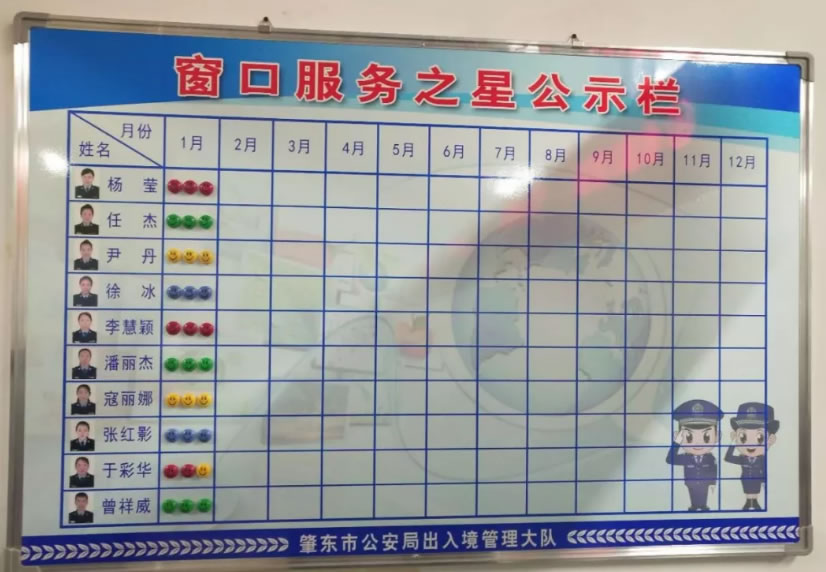 為進一步推進作風整頓優化營商環境和群眾“辦事不求人”工作,切實提升出入境窗口民警服務意識和能力水平,充分展示服務窗口良好形象,打造精品效應,深入調動和激發窗口民警的積極性和創造力,從今年3月份開始,肇東市公安局出入境管理大隊擴展服務創新思路,探索隊伍管理新模式,推出了“窗口服務之星”創建評比活動。